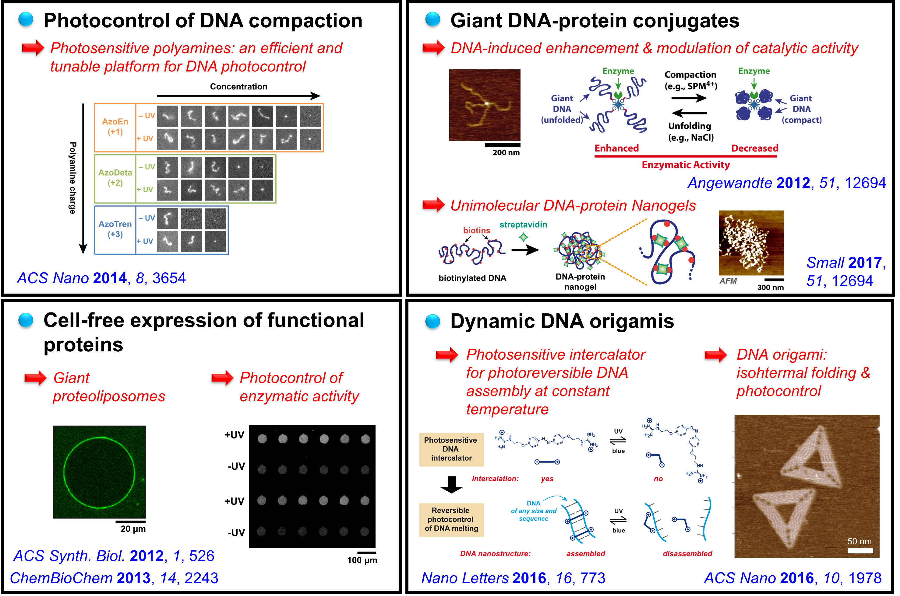 We exploit intrinsic soft matter properties of biological systems (DNA, proteins, membranes) to regulate their functions as well as we implement programmable biological functions in synthetic soft matter systems. For instance, we use photocontrol of DNA compaction to regulate the activity of encoded or conjugated proteins while photoreversible DNA hybridization is applied for isothermal photocontrol of DNA nanostructures (e.g., DNA origamis).