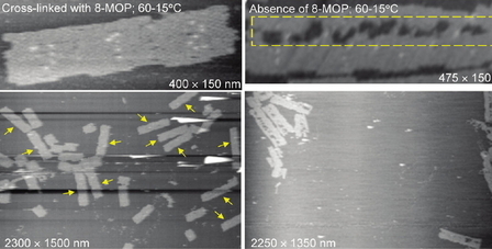 Authors used a cross-linker that can penetrate easily into the double helix and bind covalently and irreversibly to both strands of the DNA. A known psoralen (8-methoxypsoralen) ability to bind covalently DNA strands under UV irradiation was used for this purpose.